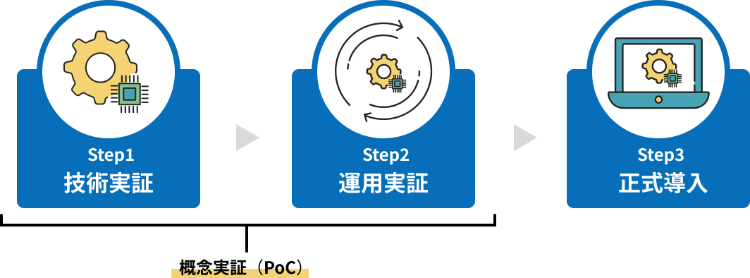 小規模な 概念実証(PoC) から始め、効果を試しながら安心して正式導入に進めます。